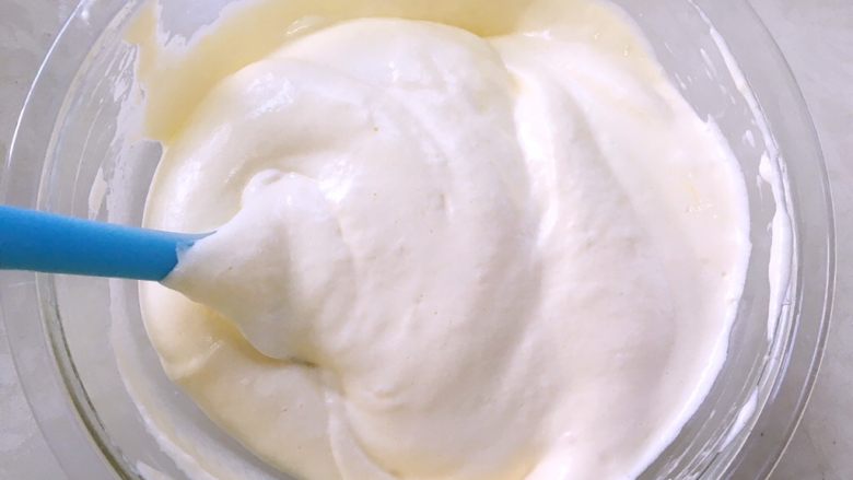 6. 烤箱预热160度,取三分之一打发好的蛋白霜,加入到蛋黄糊中,用蛋抽翻拌均匀