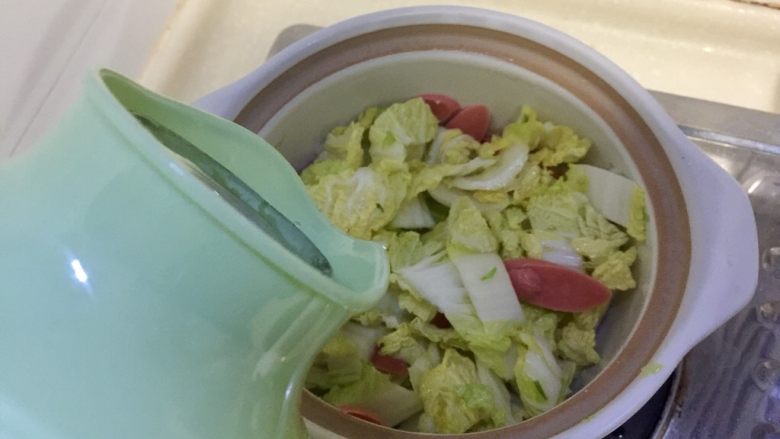 13. 加入适量清水或高汤,没过娃娃菜,煮开