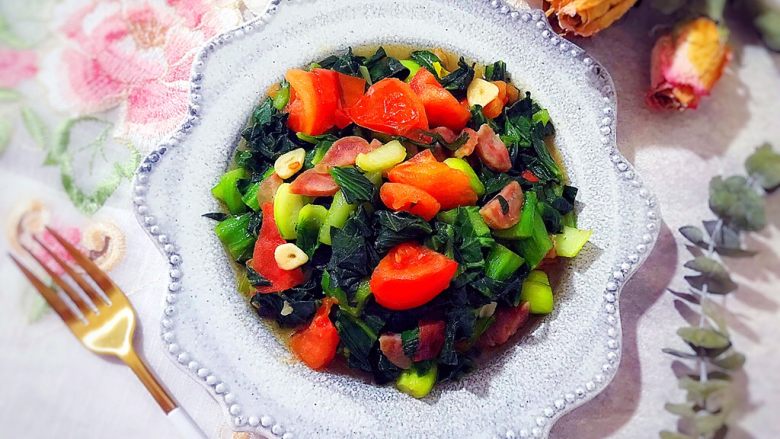 创意料理の迎春接福~蒜香小油菜番茄炒腊肠