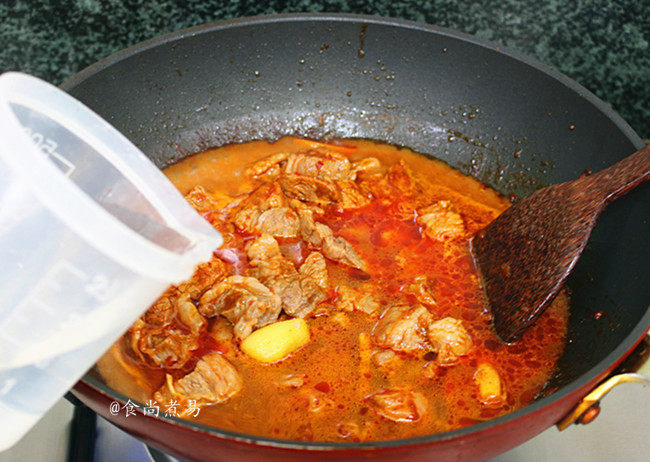 8. 将焯过水的牛腩倒入炒锅中,大火煸炒片刻