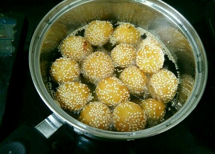 7. 先在丸子上抹点水,然后放到芝麻里滚一圈,让丸子沾满芝麻。