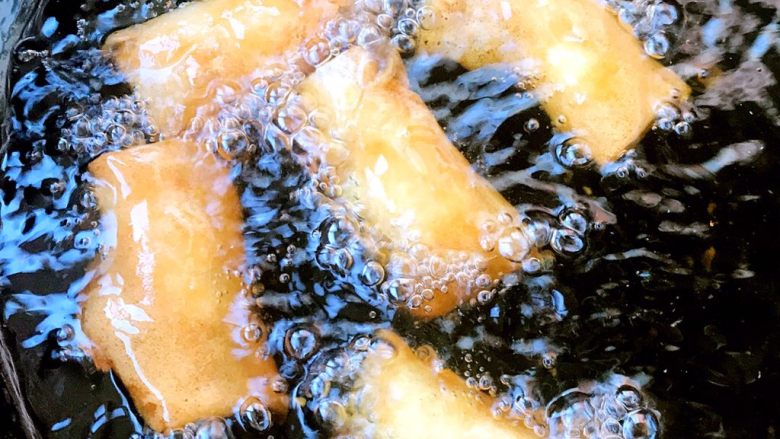 3. 豆沙春卷炸制金黄色即可盛出