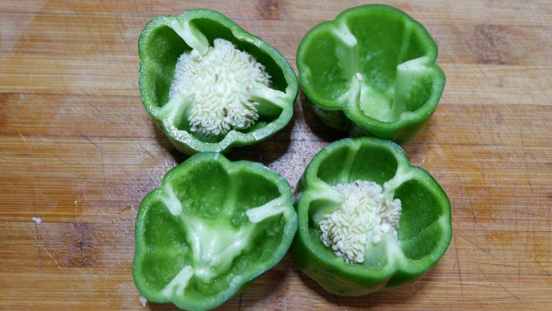 1. 把青椒1/3开的方式,切开。