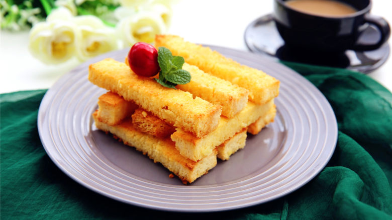 11. 酥脆可口的蒜香面包出炉。面包放凉,装盘。