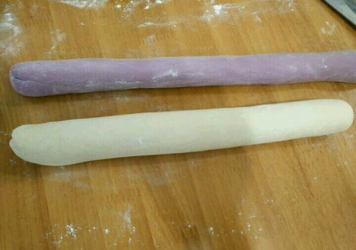 4. 把面团充分排气,搓成条。紫色的比白色的稍微小点。
