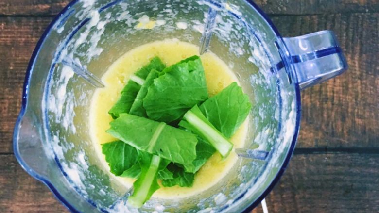 - 将青菜叶折起来是为了更快的打散,蜂蜜也可以在倒入机器一起搅拌,看个人,有的喜欢纯粹果汁不加蜂蜜,那就自行调节