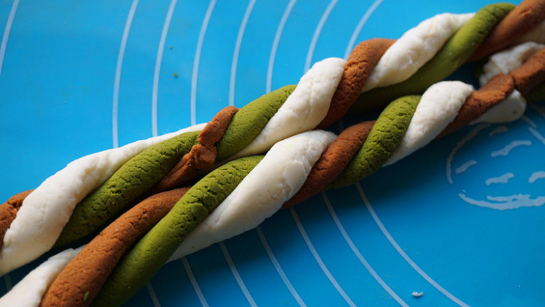 8. 将三条面团像搓麻花绳一样搓在一起使其颜色均匀