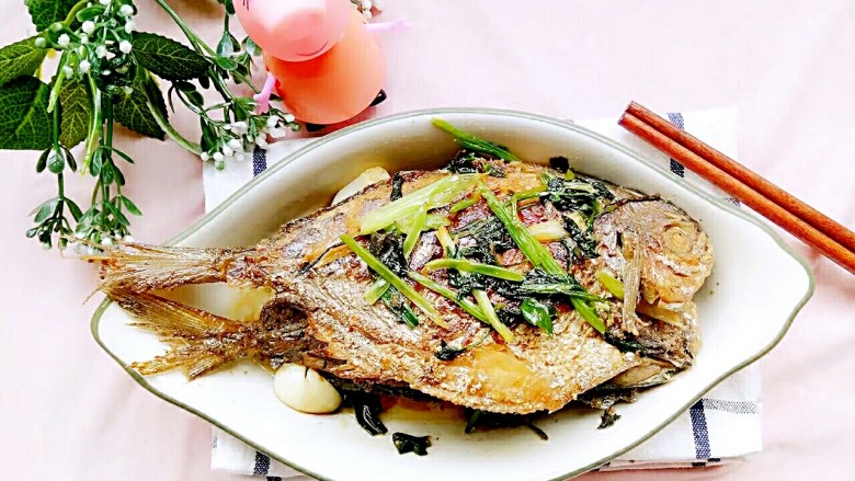 12. 鱼煎至两面金黄后把锅里的油倒剩一点点在放入葱,香菜,蒜头煎最后加入一勺盐,一勺酱油和少许水煮到收汁