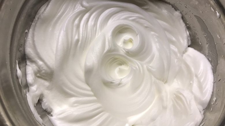 8. 分三次加入细砂糖,用电动打蛋器打发至硬性发泡