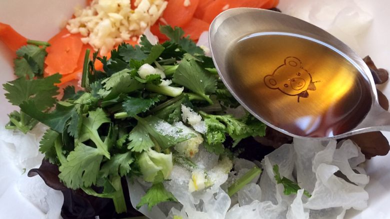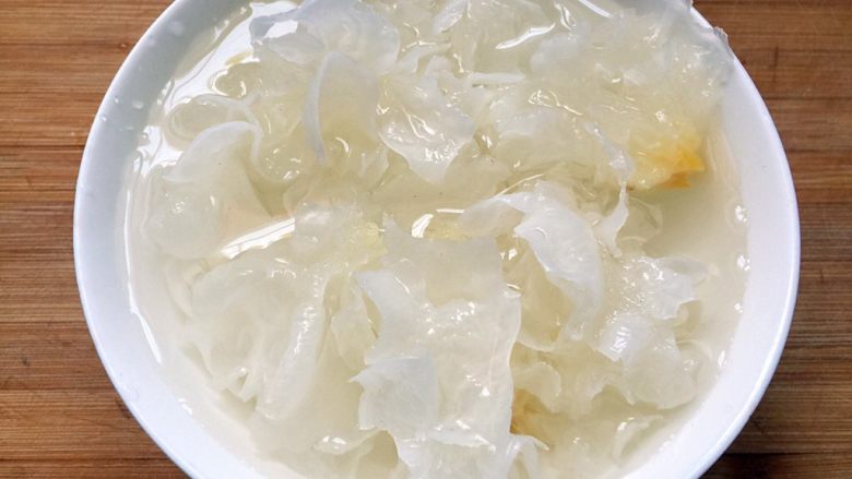 6. 黑木耳、银耳、胡萝卜片分别烫熟,装入碗中