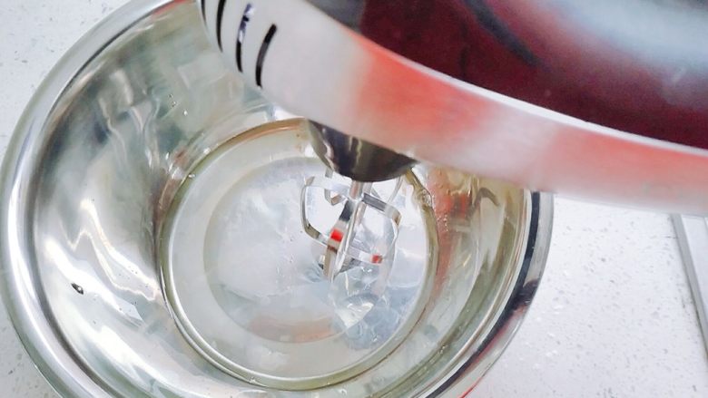 11. 用电动打蛋器打发蛋白,我用的高速。如果盆大,蛋白少,把盆倾斜起来打。
