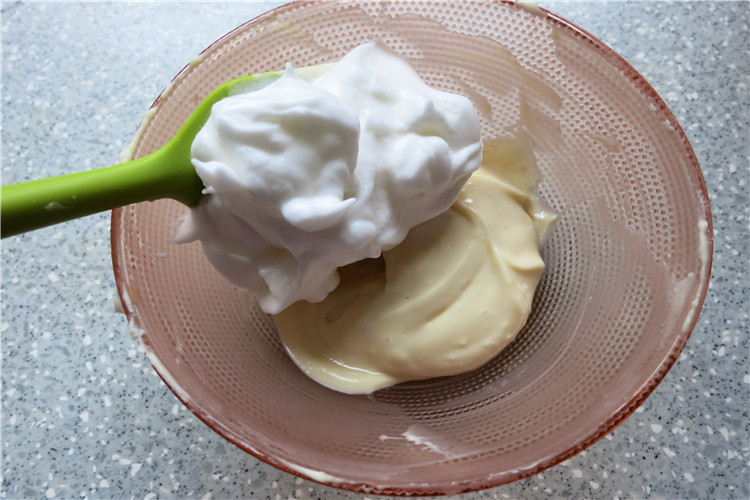 7. 取1/3蛋白加入酸奶糊用刮刀抄底加切拌的方式翻拌混合