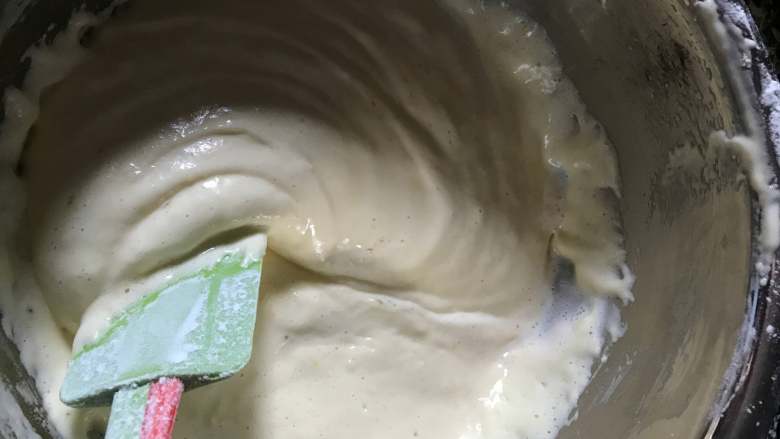 9. 筛入面粉翻拌,采用同样的手法,面粉需要2-3次加入。