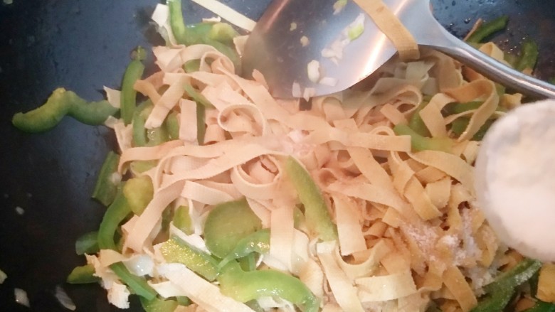 9. 豆皮五分热时,再放入青椒。(青椒加热时会破坏维生素,所以时间要短。)