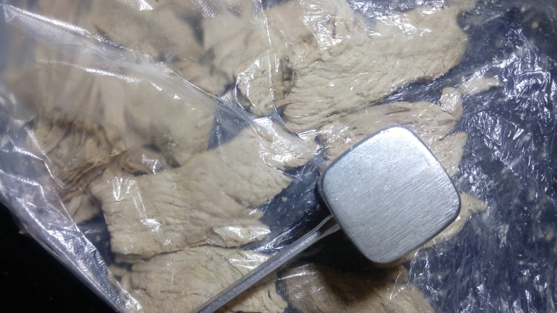 5. 家里有肉锤的也可以用肉锤轻轻敲打一遍,也很方便,我是觉得这样更快和省力气。找到适合自己的方法就行。