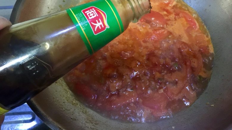33. 加入一大勺番茄沙司,翻炒均匀,加入适量热水,没过番茄,比一半汤羹加的水要少,烧开后转小火,咕嘟两三分钟让番茄味道融入汤中