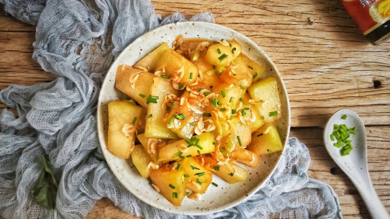 21. 再焖煮1~2分钟左右,看冬瓜块全部变得晶莹剔透的感觉了,就可以马上改大火收汁,撒葱花,关火。