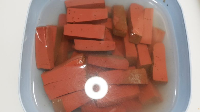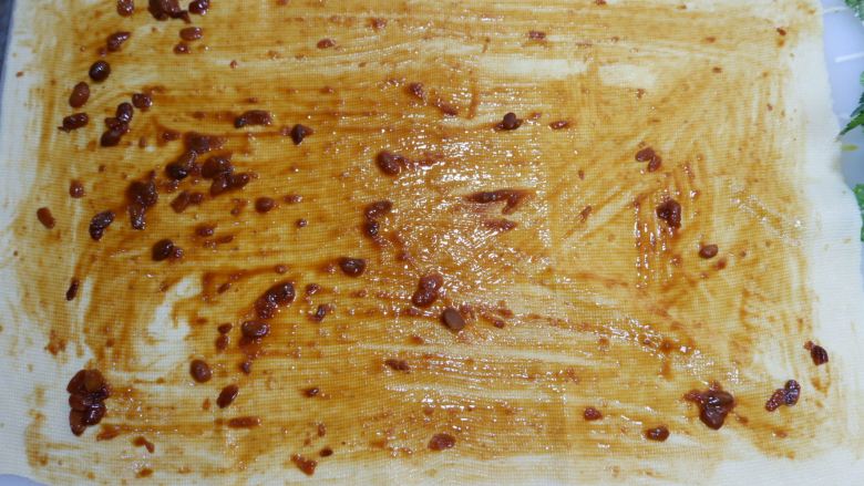 4. 干豆腐洗净沥干水。平铺在案板上,涂抹上一层甜面酱(我用的黄豆酱)