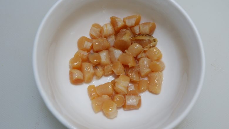 12. 淘洗好的米中加入足量的清水,然后依次加入干贝,食用油,细盐,搅拌均匀,电饭煲启动常规煮粥模式,大约30分钟。
