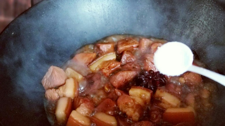 12. 可以用一根筷子扎一下来辨别猪肉是否烂糊,觉得可以了,就可以加入盐,炒至均匀。