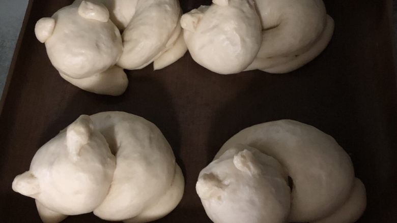 17. 放入垫了烤布或烤纸的烤盘,放烤箱发酵,下层放一盘开水制造温度湿度,15分钟换一次,发酵至两倍大即可,大概60分钟
