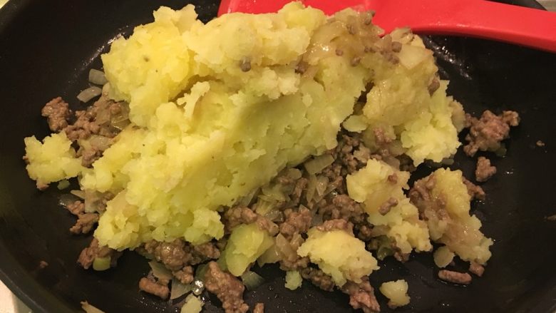 18. 继续拌炒到混合均匀,捏出8个马铃薯肉饼,sorry我没拍…手上黏糊糊的😛