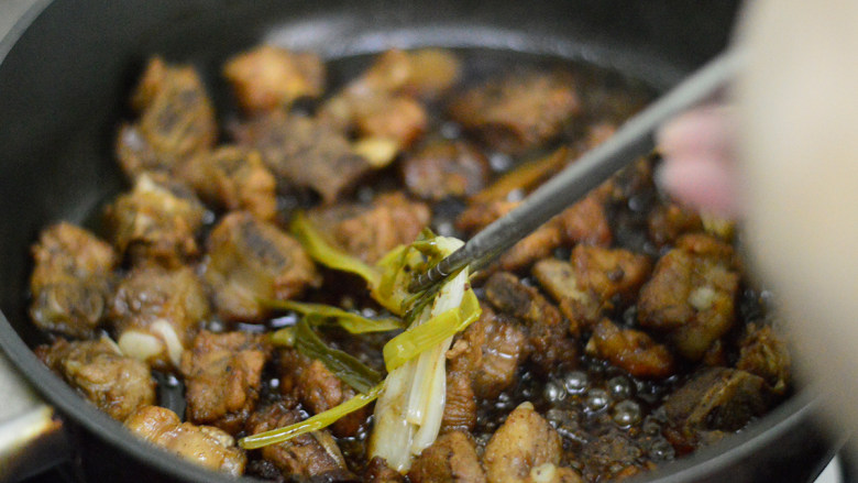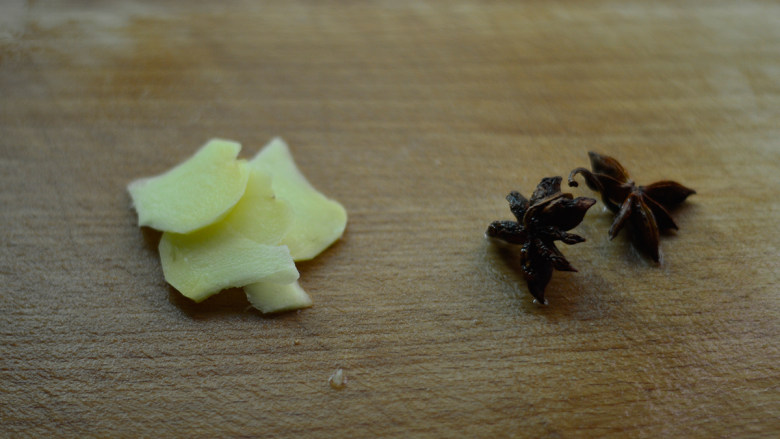 5. 炒至排骨微焦后放入姜片、八角,炒出香味