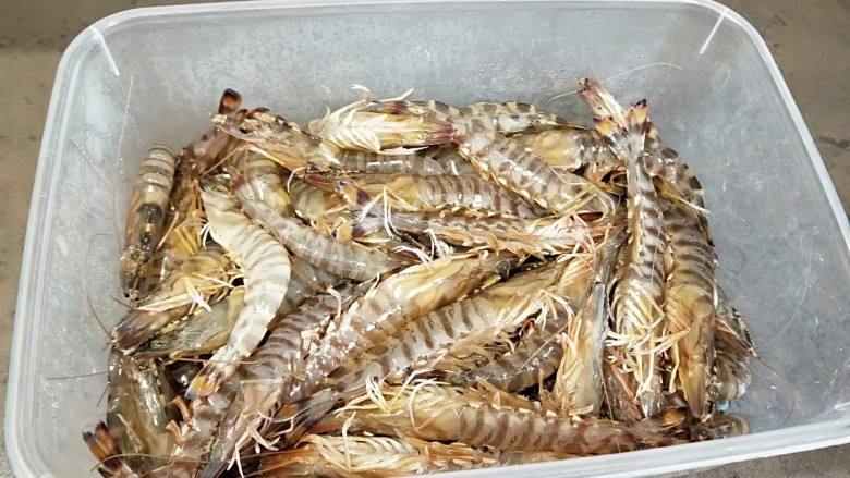 5. 锅中放适量水烧开,开锅后倒入几滴食用油。倒入九节虾煮开,变色捞出来。