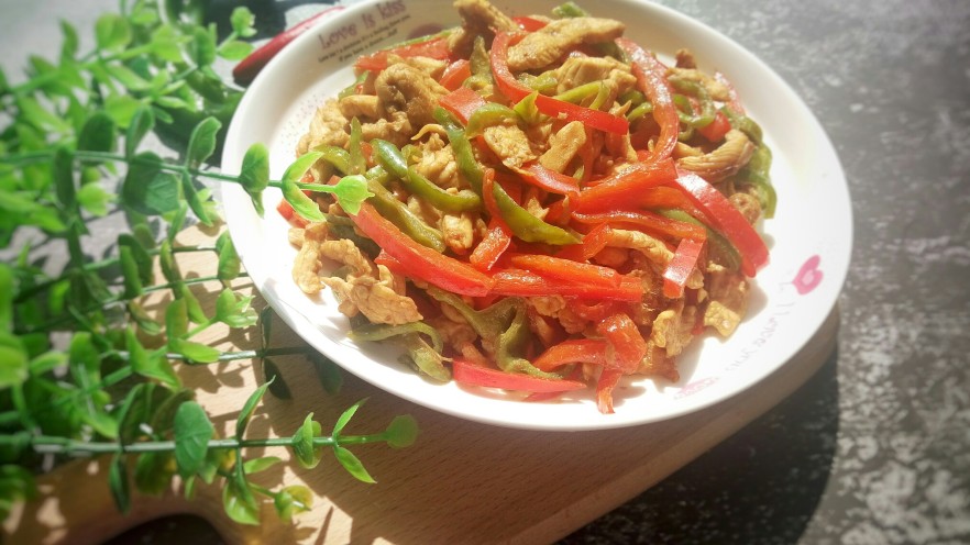 1. 准备材料:鸡胸肉洗净切鸡丝,青红辣椒各一个!