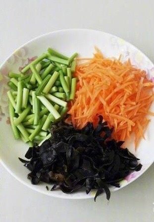 8. 倒入切好的蒜苔、胡萝卜、木耳翻炒一下,再倒入番茄酱