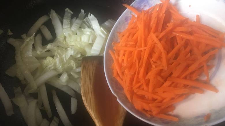 9. 起油锅,待油温8成热后,倒入白菜(先倒白菜茎部翻炒一下,再倒叶子继续翻炒);