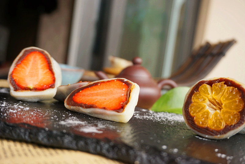 10. 将包裹好的草莓大福和橘子大福上撒上熟糯米粉防止沾粘,为了切出来的美观性,草莓是从尖部向底部竖切,橘子是从中间横切,这样就能完整的观赏到橘子和草莓美丽的纹路了