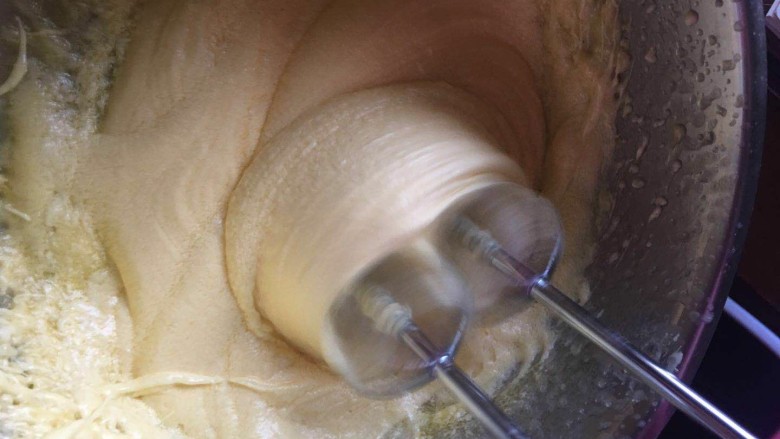6. 分三次加入蛋液,倒入一部分打至融合再加入第二次,打融合在家第三次。