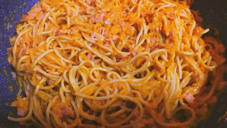 8. 翻炒均匀,尽量让每根意面都沾上南瓜酱