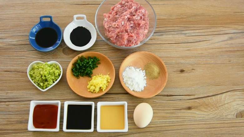 2. 鸡蛋打散、姜葱末、淀粉、胡椒粉、香芹末、料酒、生抽一勺与肉糜顺时针搅拌均匀,搅拌到肉紧实有劲道为止。