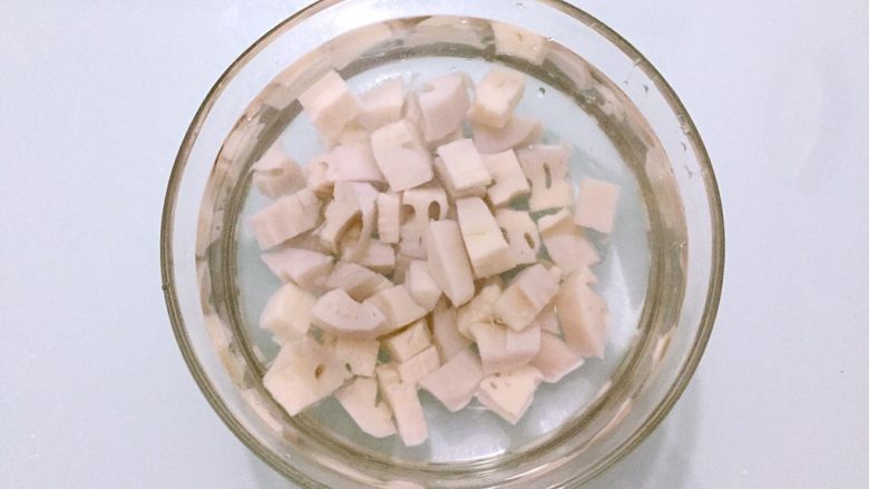 2. 清水加入少许白醋,把藕丁放入浸泡备用