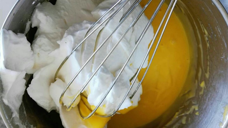8. 用手抽把蛋黄糊混合均匀,不要画圈圈。混合好放一旁待用。