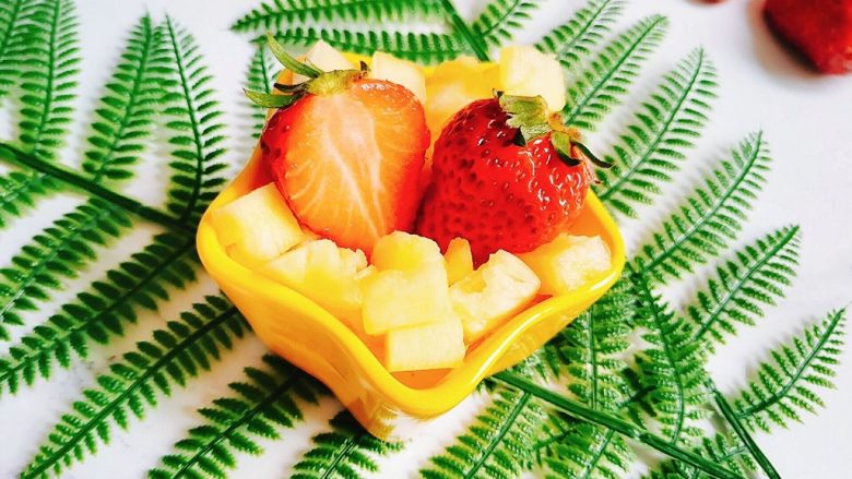 12. 草莓对半切,然后放到中间的空里。摆好后不要急着吃,再放到冰箱冷藏一会儿,口感更好哦。一杯简单的草莓菠萝甜品就做好了!超级简单吧,水果可以自己换!