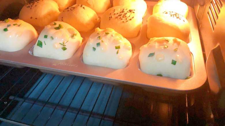 13. 放入烤箱,上下管30度,烤箱放一碗水保持湿度,发酵至9分满;
