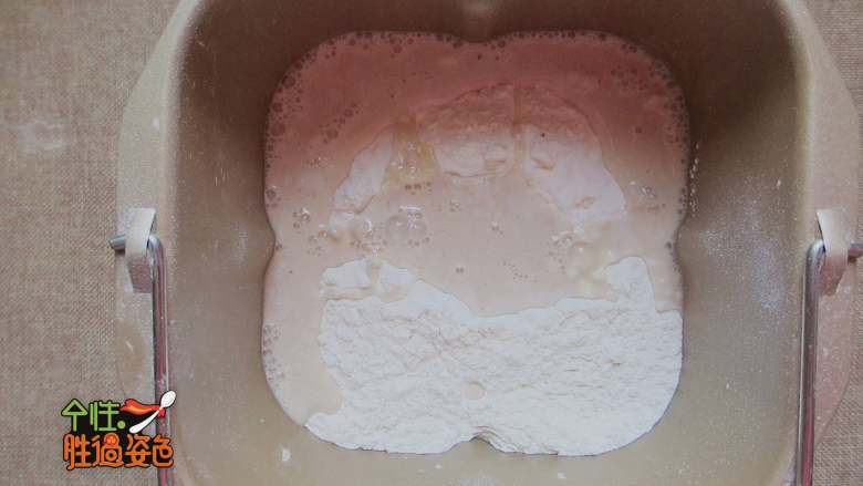 2. 将安琪干性酵母粉用温水加糖泡开。放置十来分钟