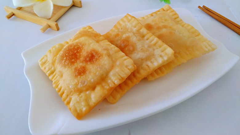 - 用水把馄饨皮四周蘸上水,在放上一张馄饨皮,炸的时候不开口,用叉子在四周压一圈,用中小火炸制两面金黄即可。