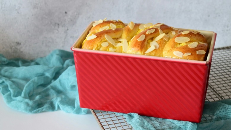14. 放入阳晨中国红吐司模具里。放入烤箱,再放入一碗温水进行二发(温度不要超过38度)