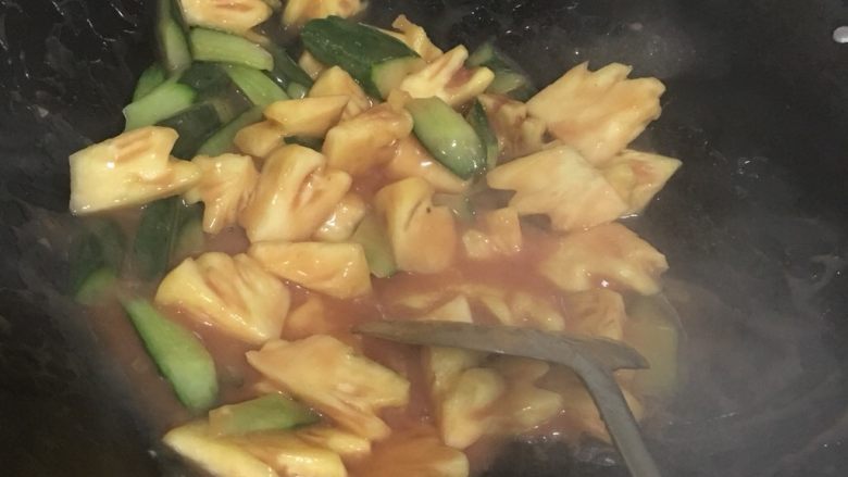 4. 放菠萝下去中火翻炒,可以加红色瓜椒跟青瓜椒一起翻炒,忘记买了,拿青瓜代替这些记得要飞水(煮开水放下两分钟弄起来过冷水)