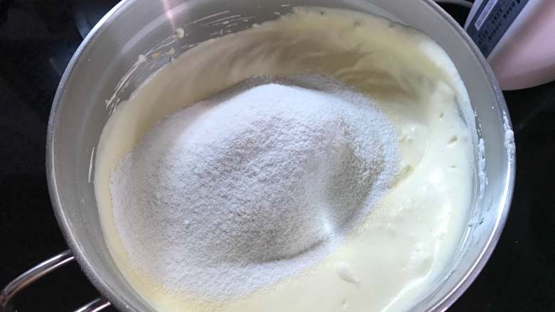 9. 将蛋黄糊全部倒入蛋白中,用打蛋器打匀。