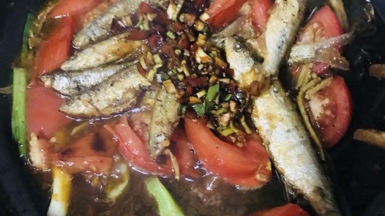 6. 然后把煎好的鱼仔仔放进锅里,加入事先做好的调料,加点点水和白砂糖,轻微翻炒,盖盖子中火焖5分钟。