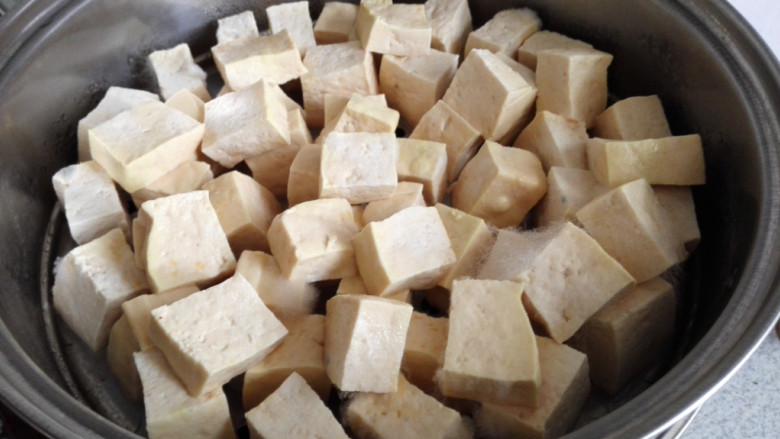 2. 老豆腐两大块,沥干水份,切成腐乳大小的方块,放在蒸锅的蒸屉上。我这个蒸屉有点小摆不开就放了两层,最好分开放啊。