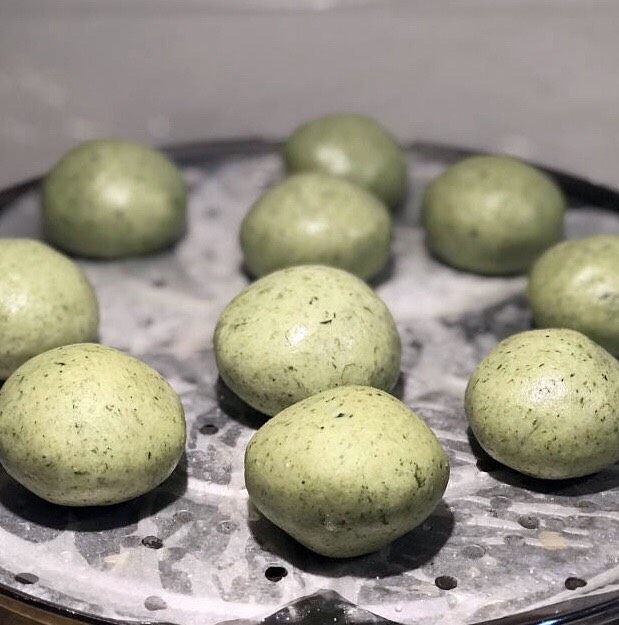21. 蒸屉上提起垫好油纸,或者刷一层油防粘。把包好的青团均匀码放在笼屉上,每个之间间隔一定的距离。