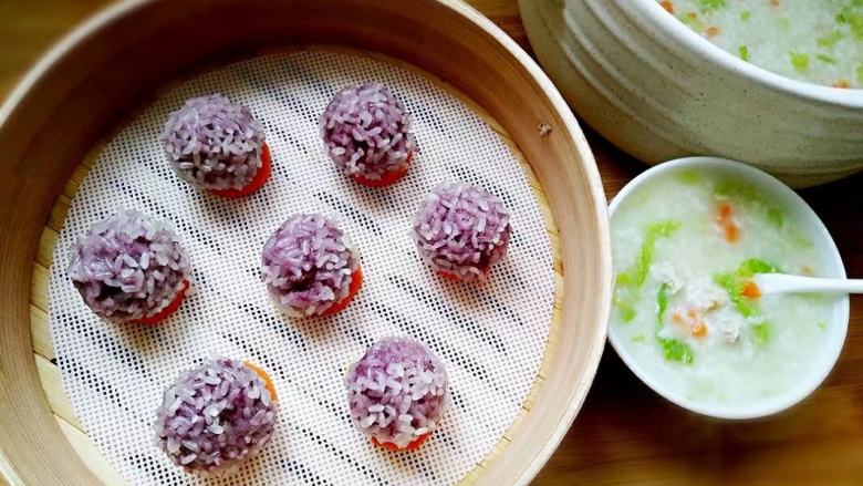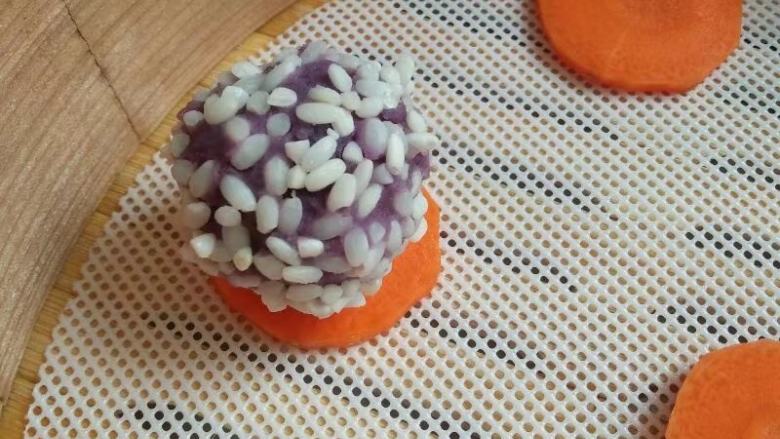 这个做出来一下就被抢完了,趁热非常好吃,当然顡值也是相当的。哈哈,紫薯是很有营养的东西,下面配着胡萝卜也是非常好吃的。糥米粘粘的也很香。当然这个要趁热吃,凉了就不好吃了哦!