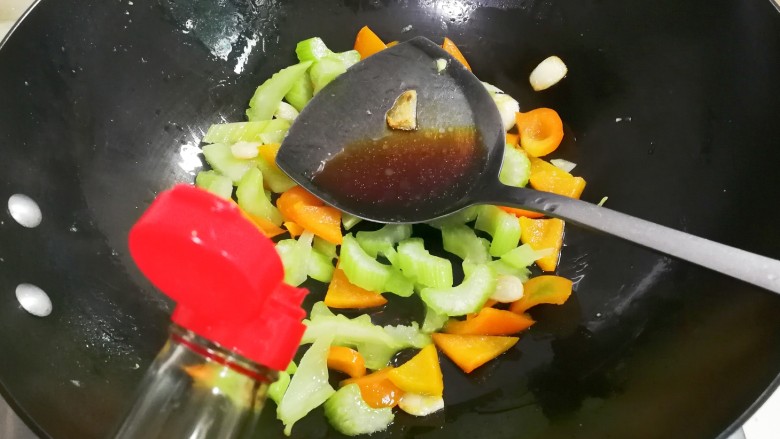 19. 放入西芹翻炒片刻