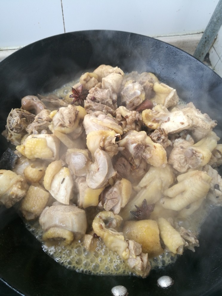 - 唠叨几句:全部食材都准备好后,发现家里没有姜了。所以图二照片里是干姜,建议用新鲜姜哦。我谱子里有写。只需两三片即可。最后看颜色有点浅出锅时加入了一勺老抽,也可以不加。三黄鸡用了大概一斤半这样子。此道菜不能用柴鸡哦。咬不动的。